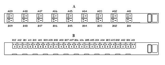 目前推荐的电源分配板的配电结构型式主要有2种,分别为A型和B型。 A型和B型的区别在于电源分配板的宽度和插座安装方式不同。电源分配板的不同配电结构和插座排列示意图如下图所示: