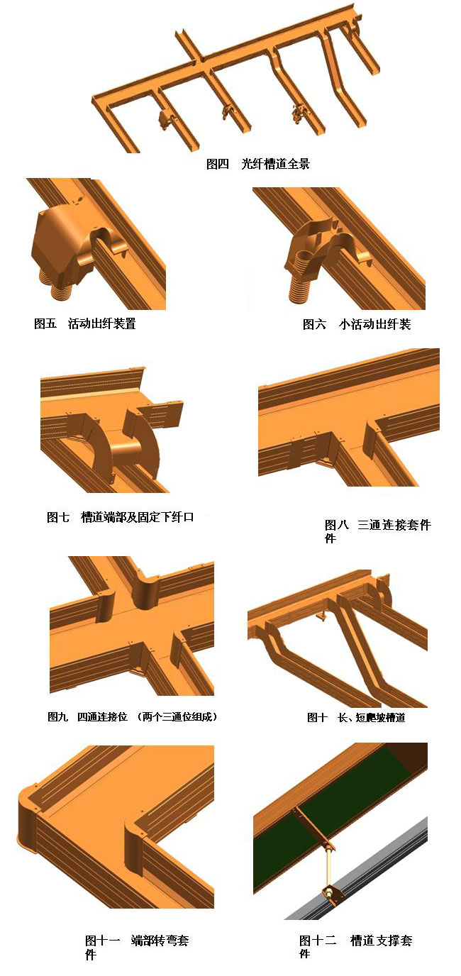 结构上,光纤槽道由以下整件组成:光纤槽道、槽道支撑套件、活动出纤装置、固定出纤口、三通连接套件、长爬坡槽道套件、短爬坡槽道套件、端部转弯连接套件。各整件的选配根据用户实际需求而定,其中波纹管需由用户自备。