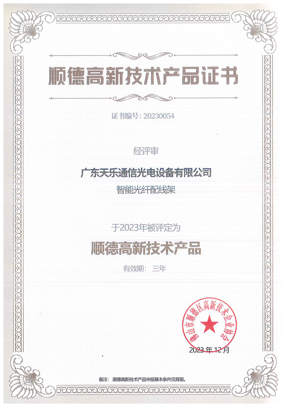 Our company's "Intelligent Fiber Optic Distribution Frame" has obtained the Shunde High tech Product
